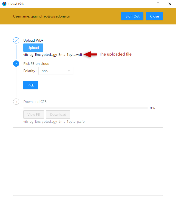 As in Fig.1-9-11, select "polarity" either "pos." or "neg."("neg." is preferred for the demo data) and click "Pick" to start the picking on cloud.