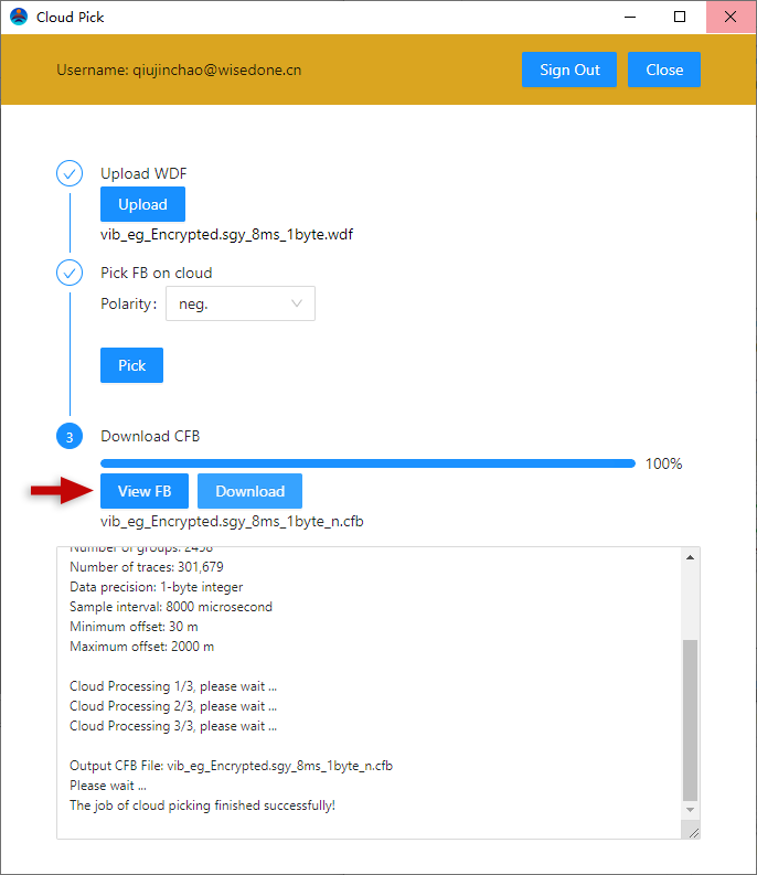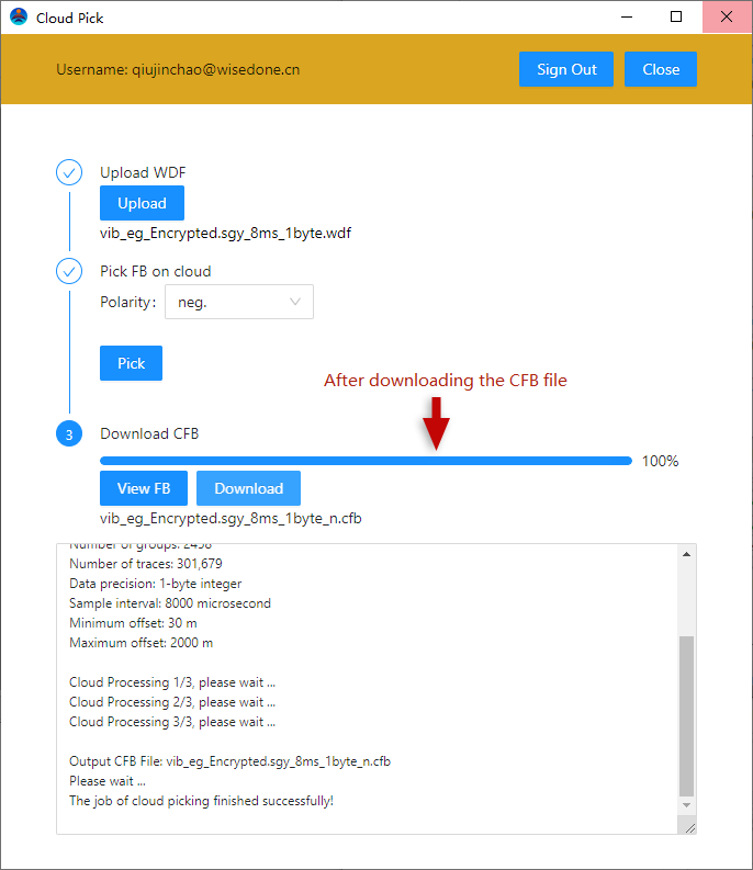 As in Fig.1-9-13, click the button "Download" to save the CFB file "vib_eg_Encrypted.sgy_8ms_1byte_n.cfb" in the project directory of the user computer.
